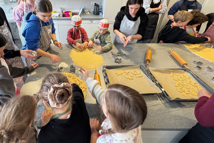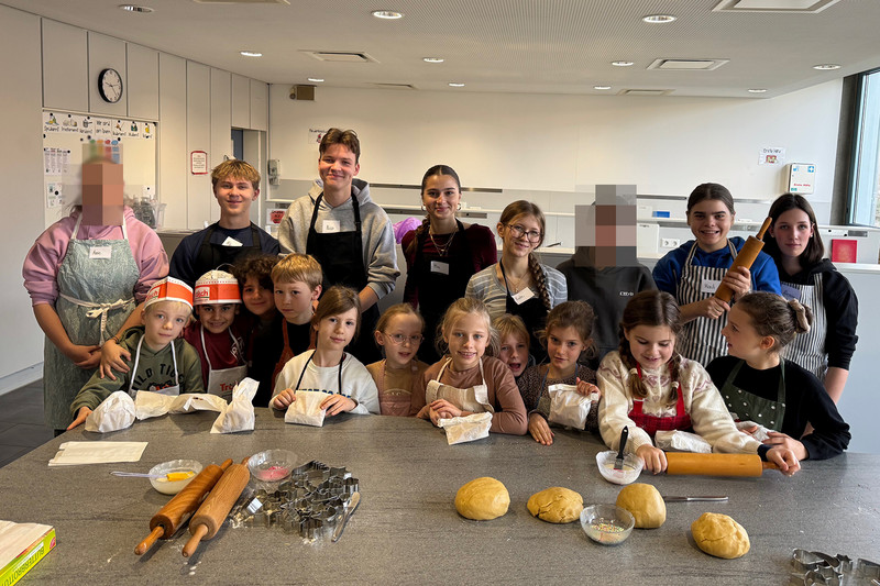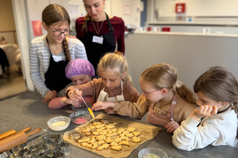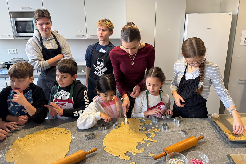 Für die Projektpartnerschaft konnte die Klasse 2b der Theodor-Heuss-Schule gewonnen werden. An einem der ersten Dezember-Tage war es dann soweit. Mit viel guter Laune und Weihnachtsmusik bereiteten die AES-Schülerinnen und -Schüler zunächst die Plätzchenteige vor, bevor um 8:45 Uhr die Grundschulkinder in die Lernküche kamen. Begleitet von lebhaften Gesprächen zwischen den Großen und den Kleinen wurden die Teige ausgerollt und die Plätzchen ausgestochen. In der anschließenden Backzeit wurde das Kennenlernen bei einem Weihnachtstee vertieft und die Wartezeit überbrückt. Der freudige Höhepunkt war zweifellos erreicht, als das Gebäck aus dem Ofen geholt, mit bunten Streuseln verziert und in Papiertütchen verpackt werden konnte. Die Schülerinnen und Schüler der 2b waren über das Plätzchen-Präsent sichtlich erfreut. Für alle Beteiligten war dieses Gemeinschaftserlebnis eine wichtige und eindrucksvolle Erfahrung. Die AES-Gruppe verabschiedete ihre Gäste mit einem Lächeln und der Erinnerung an ein bemerkenswertes Ereignis, das gelegentlich wiederholt werden könnte.